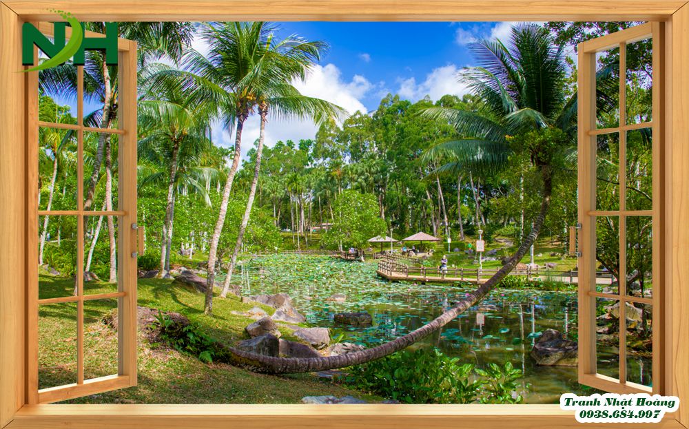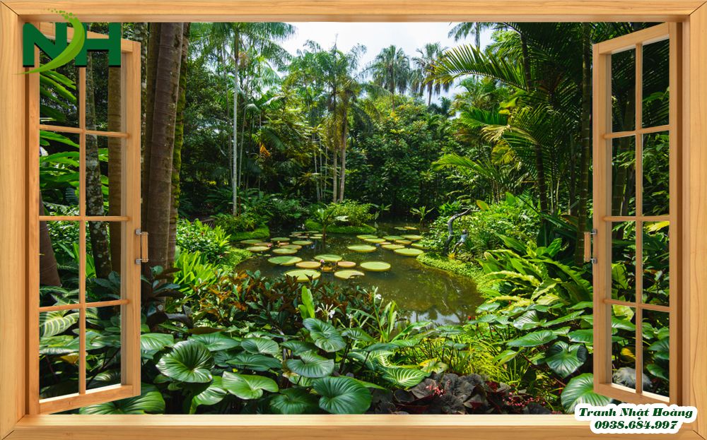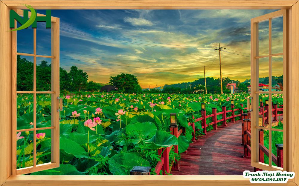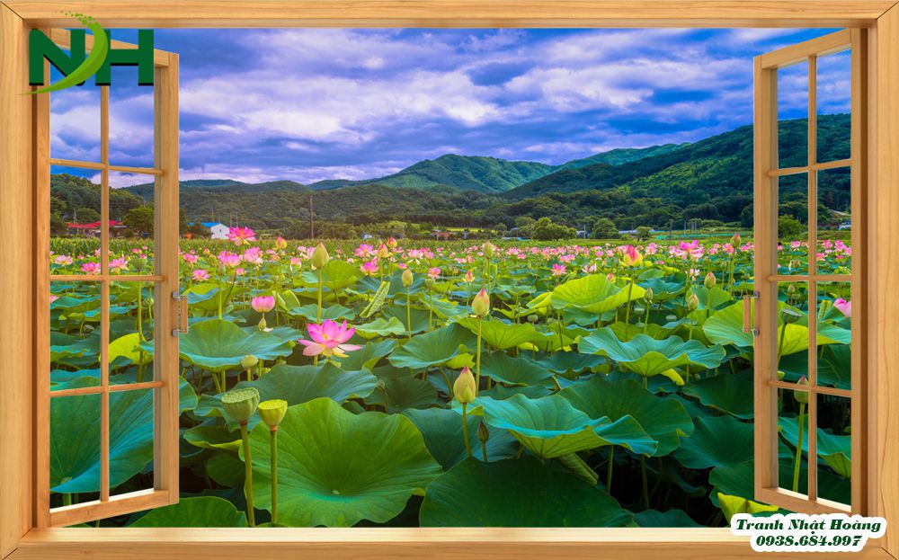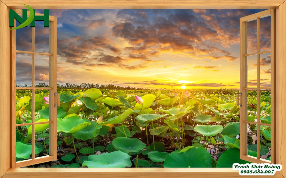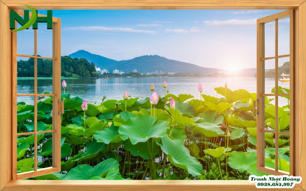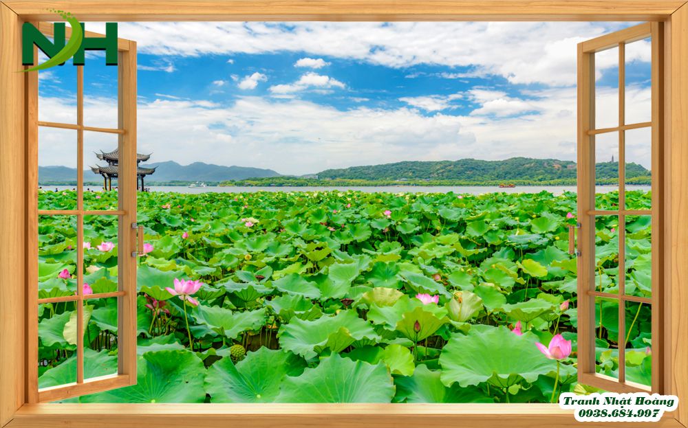 - Những mẫu tranh không gian mở, cửa sổ mở ra hồ sen là bức tranh phong cảnh thuần túy với đầm sen. Có đôi thiên nga đang cùng nhau bơi lội, cánh bướm bay chập chờn. Những đóa sen đẹp nở rộ khoe sắc hương. Những tán lá sen xanh xanh trải dài khắp mặt hồ. Tất cả đều rất chân thật, bắt mắt.
