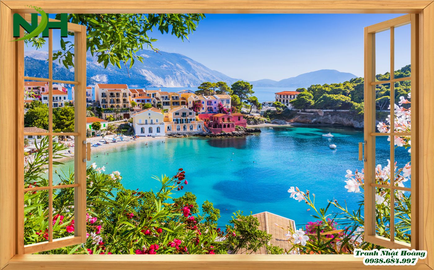 Tranh gạch ốp 5D cửa sổ.là mẫu góp phần đưa không gian đẹp của thiên nhiên vào trong ngôi nhà. Từng yếu tố cây dừa, thuyền biển, nước biển trong xanh tất cả đều chân thật như một cảnh biển thu nhỏ.